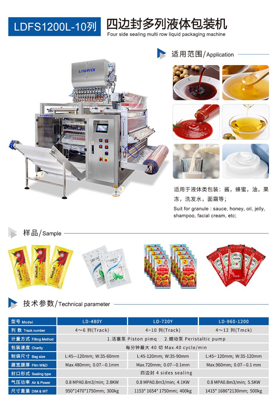首页/产品/主打产品/辣椒酱多列包装机(10列) 辣椒酱多列包装机(10列) 本机为10列四边封包装机,适用于医药、保健品、食品等液体大批量生产包装,例如:颗粒:感冒冲剂、干燥剂、种子、白砂糖、味精;酱料:番茄酱,辣椒酱,辣椒油;粉末类:固体饮料,酵素等 Category: 主打产品 Tag: 四边封 Description 产品视频 详情页 设备咨询表单 Description 产品视频 详情页 设备咨询表单请在浏览器中启用JavaScript来完成此表单。请在浏览器中启用JavaScript来完成此表单。您的姓名: *联系方式 *公司名称 *E-mail询价表单 *提交表单 Related products 番茄酱多列包装机(8列) 蛋黄酱多列包装机(6列) 护发素多列软膏包装机